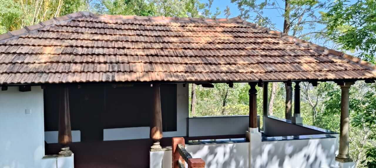 The traditional sloping tiled roof, strong wooden pillars, and spacious veranda reflect classic Kerala architecture. From the sit-out area, you can enjoy the sights and sounds of the forest — rustling leaves, chirping birds, and the cool mountain breeze that flows through the hills.