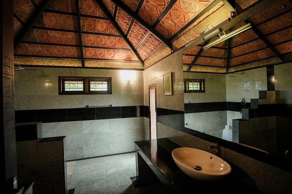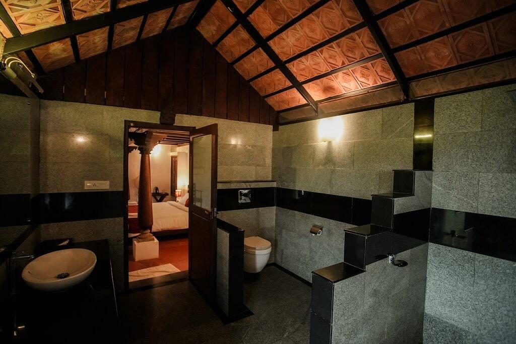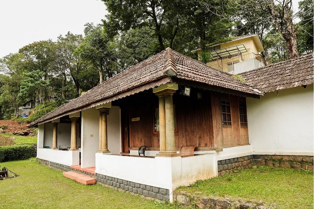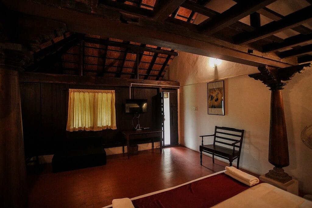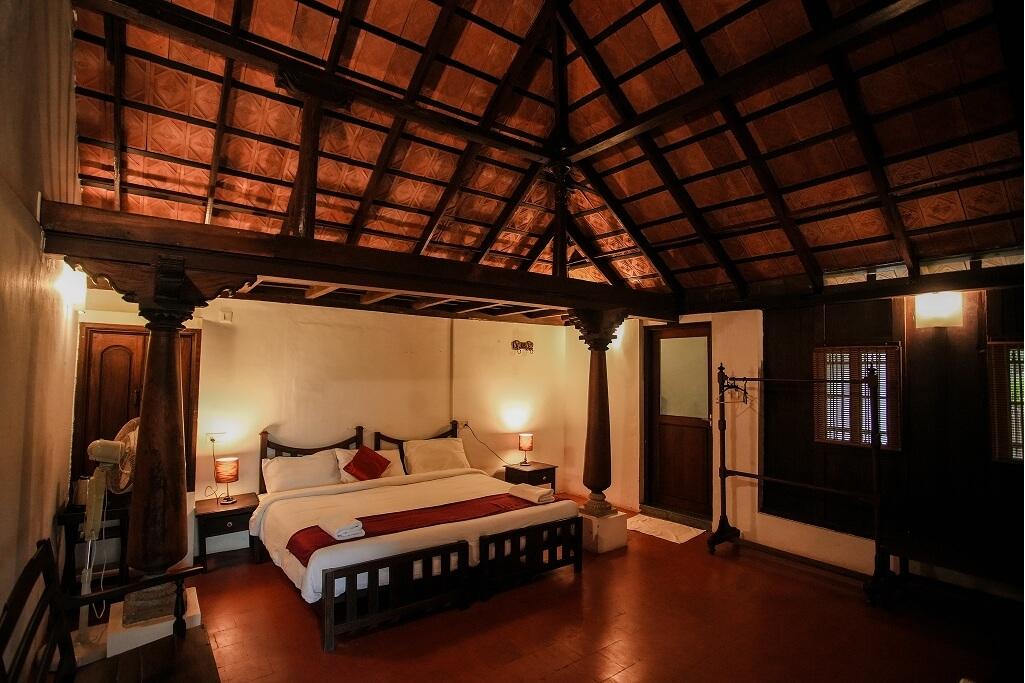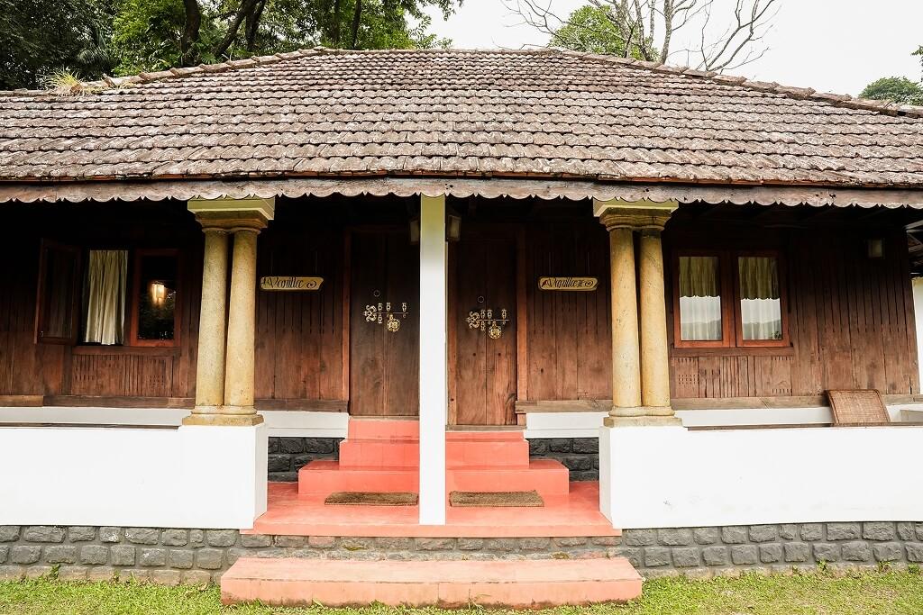The interiors celebrate classic Kerala architecture, highlighted by an elegant wooden ceiling, traditional pillars, and warm earthy tones. Thoughtfully designed and inviting, the cottage creates a cozy yet refined space where you can truly relax and reconnect with nature.